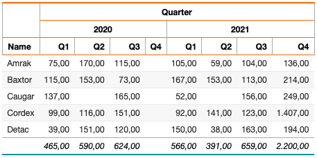 In this example, the months were derived from the fetched data, reflecting their order and actual values. However, if you need to explicitly define all months (1–12) and control the column order, you can do so using the dbr.crosstab.col command.