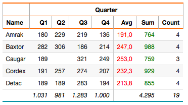 You can apply aggregate functions to both row and column values. For columns, use functions such as dbr.sum, dbr.min, dbr.max, dbr.avg, or dbr.count. For rows, use dbr.hsum, dbr.hmin, or dbr.hmax.
