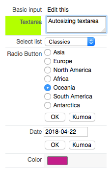 Specifies the input method for editing if something else than plain input. Supported types include:inout(the default)textareaautosize(automatically resizing textarea)select(standard dropdown list)select_find(searchable dropdown list)autocomplete(AJAX-based search)radiobuttoncheckboxdate/datepickerdatetime/datetimepickertime/timepickercolor/colorpickerrichtext(requires the Rich Text extension)file_rename- Code editing: