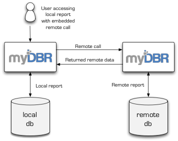 myDBR looks for the server 'my_remote_mydbr' as defined in the settings and calls the report 'sp_DBR_remote_first' on that server, passing 'inDate' as a parameter. The result is stored in a regular local table named 'mylocaltable'. For the second remote call, the result will be placed into the recently created temporary table 'remote_data_tmp'. Remote calls can contain only one result set, and the format must match that of the local table.
