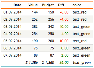 The following example produces the same result using dbr.cellclass with the predefined CSS classes redclass and greenclass:
