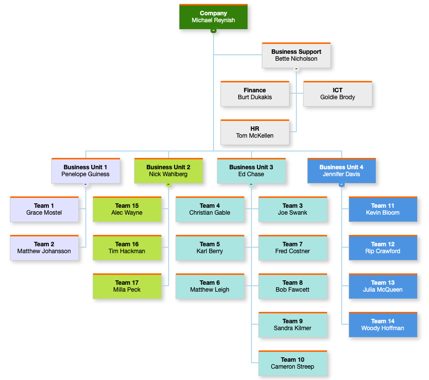 Automatic balancing often results in a wider, shorter chart. For example, a "Business Support" node without siblings might be placed to the left, while other nodes with siblings are placed underneath. This is ideal for organizations where nodes have relatively few siblings.