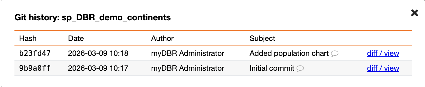 Alternatively, open the procedure editor in myDBR, load any stored procedure, click Commit, fill in a subject, and confirm. A message like Committed to Git (a3f9c12). in the toolbar confirms everything is working.