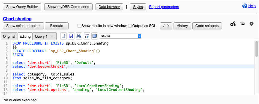 View the definition of a selected database object (table, procedure, or function) or myDBR command in a new tab. -
