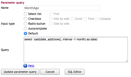 For example, a statistics report might default to showing data for the past month. You can define a default query in Admin -> Parameter queries:
