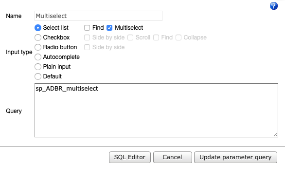 Multiselect fields allow users to pick multiple items from a dynamic, AJAX-driven list. myDBR passes these selections to the report as a comma-separated string of IDs.